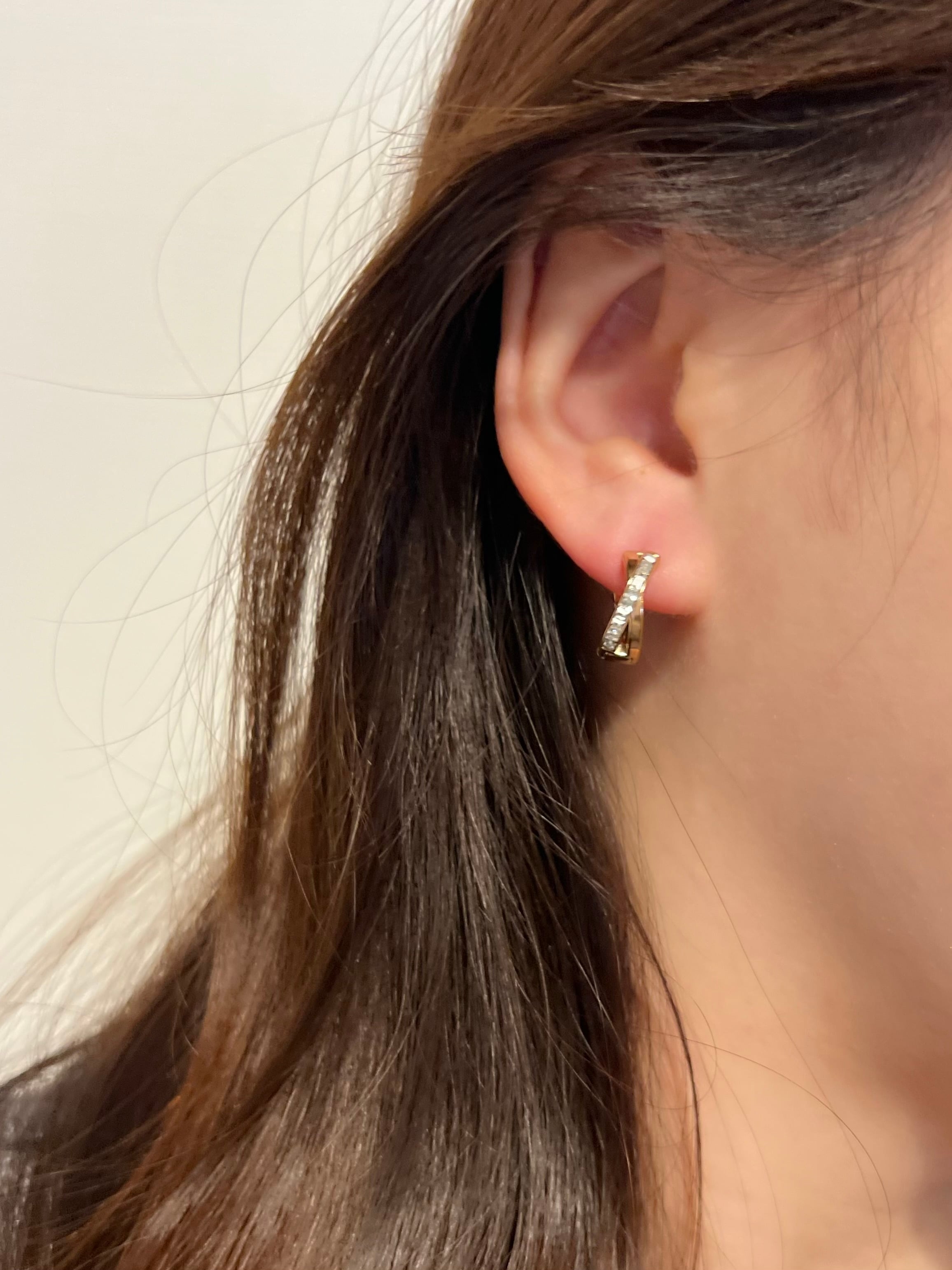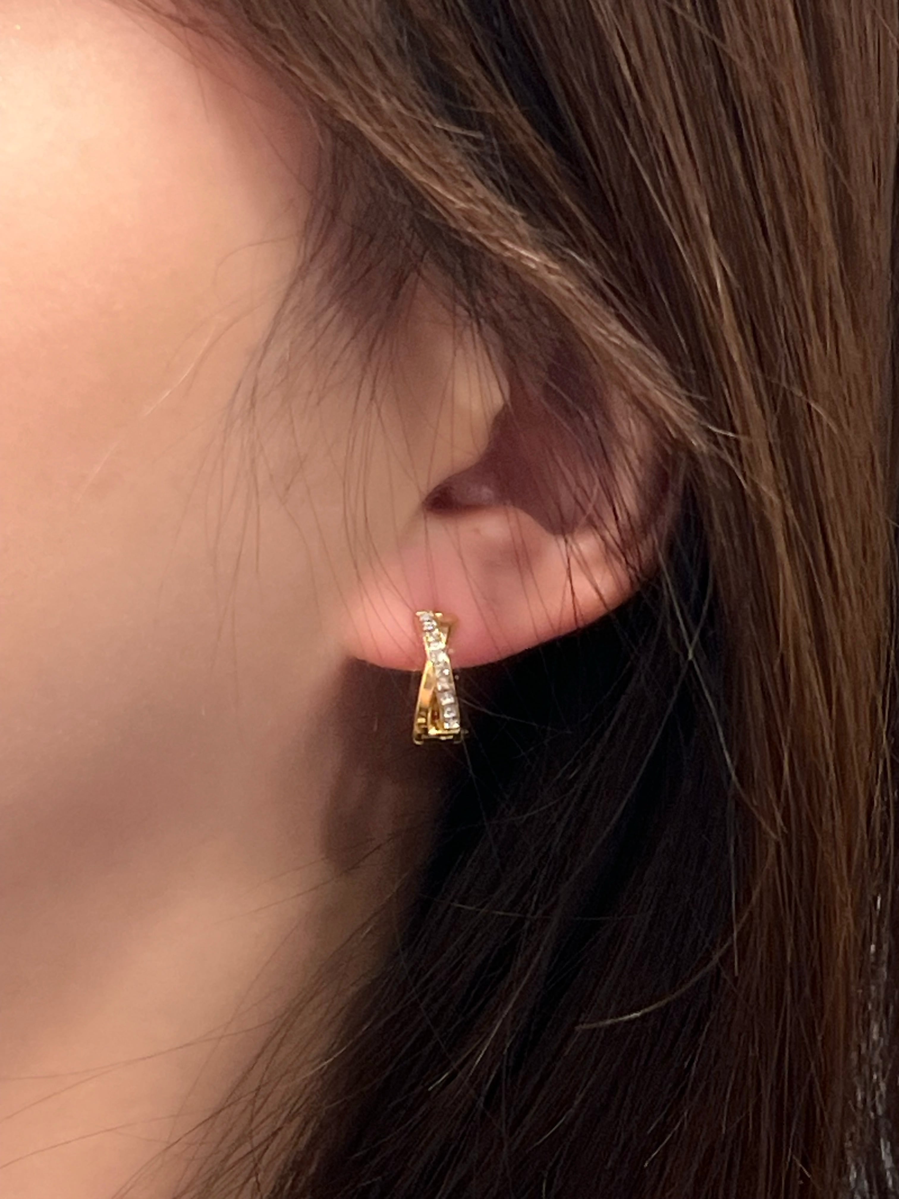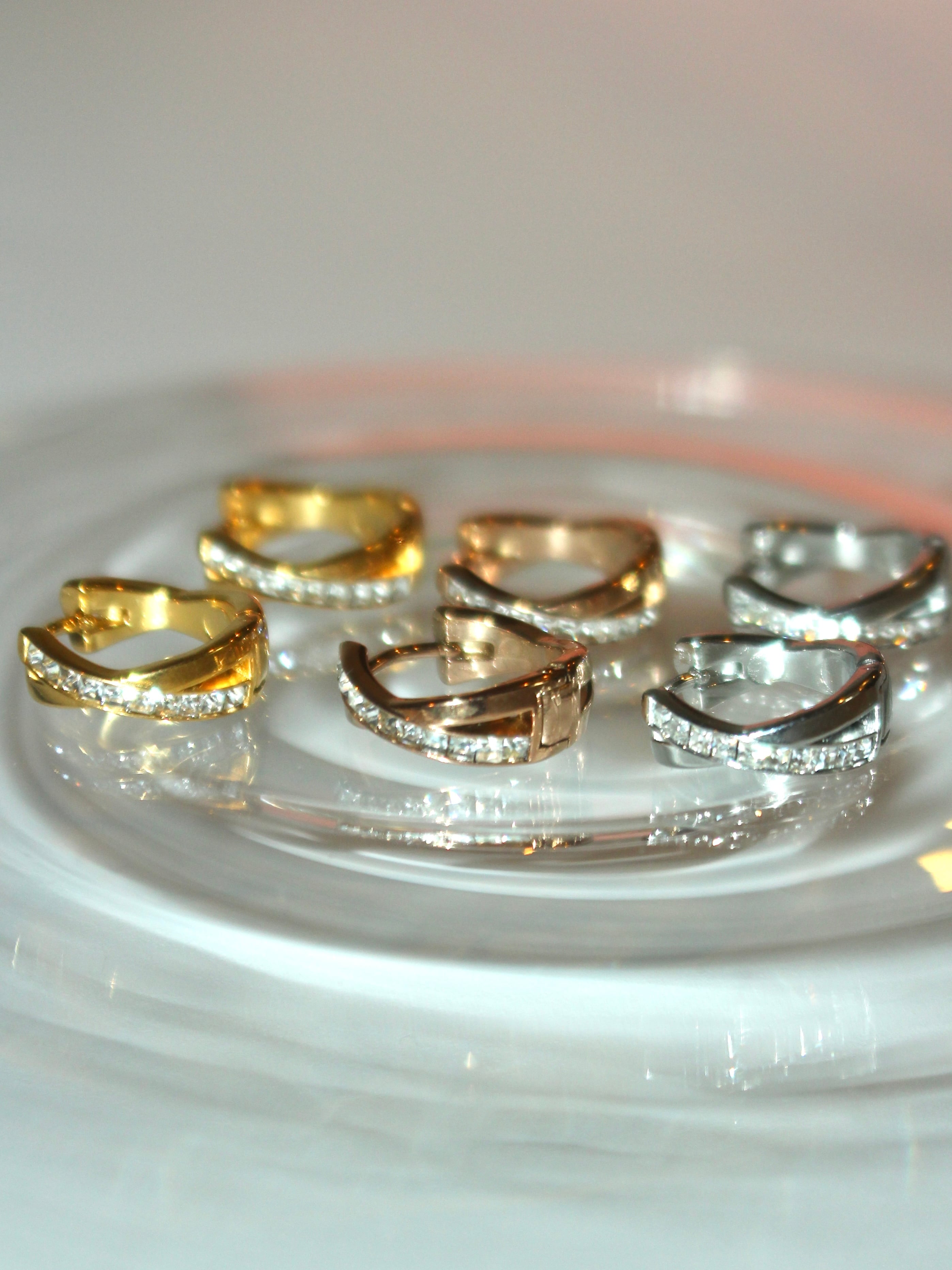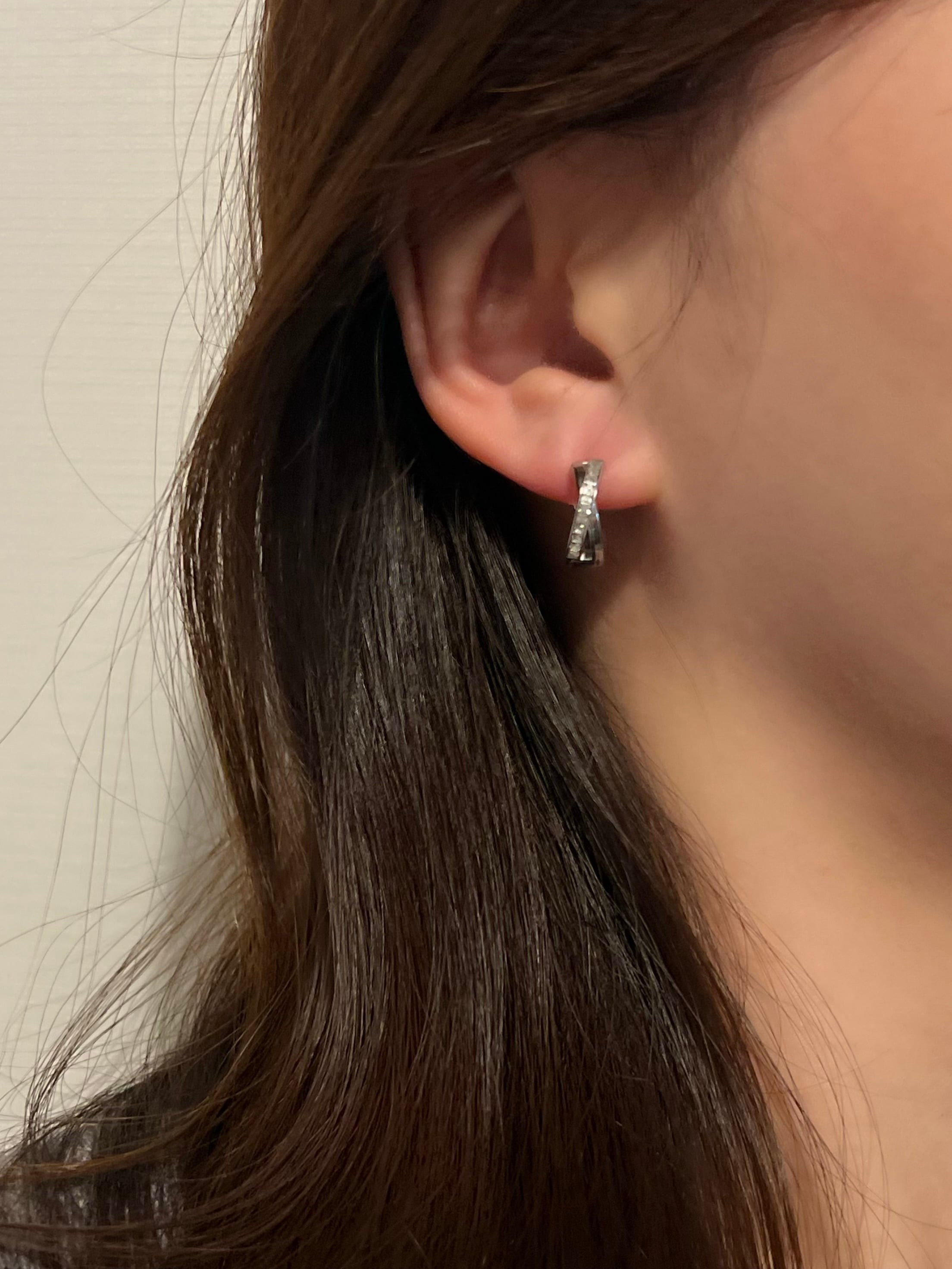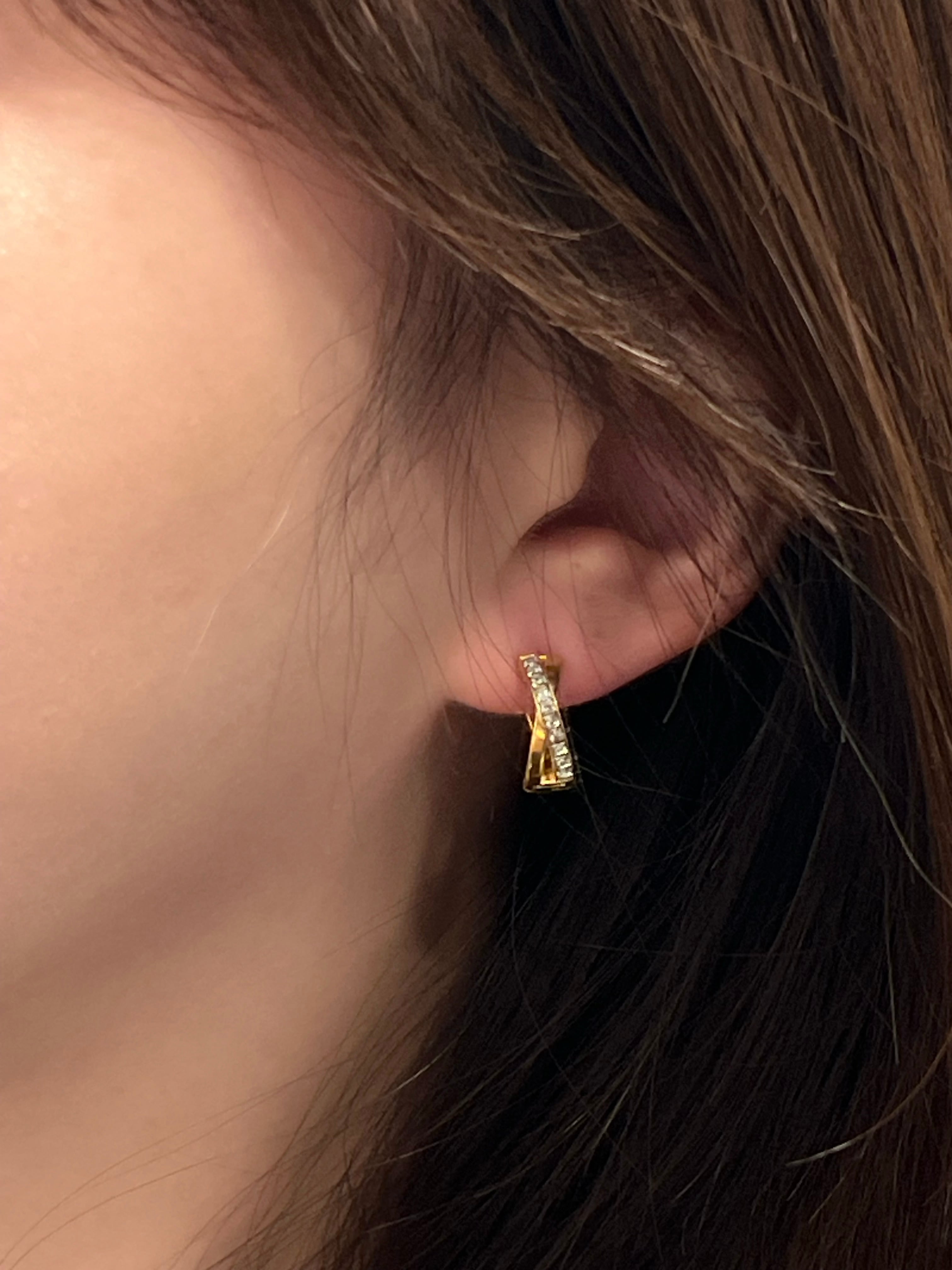 交差するラインに、きらりと輝くジルコニアを添えたフープピアス。