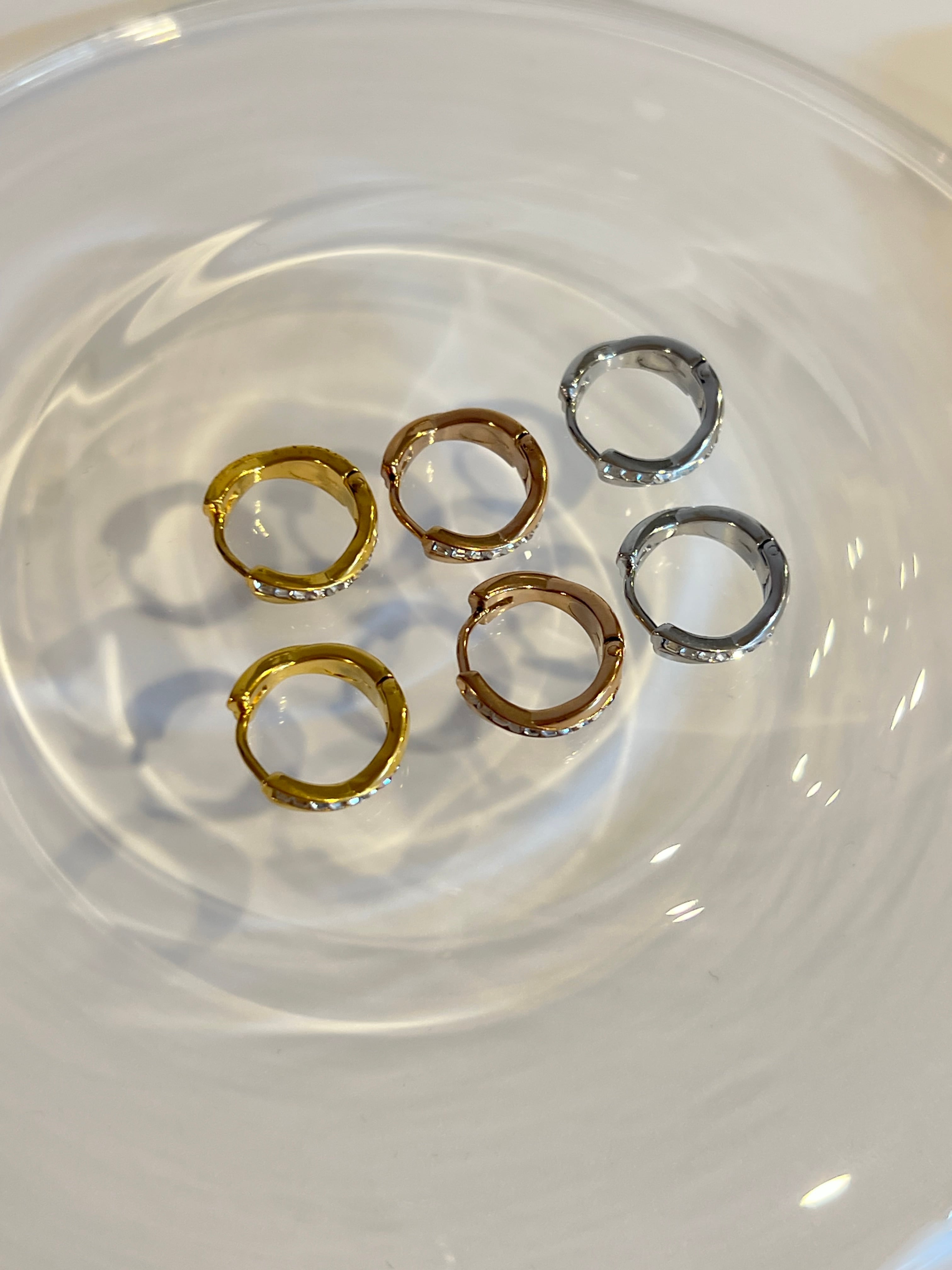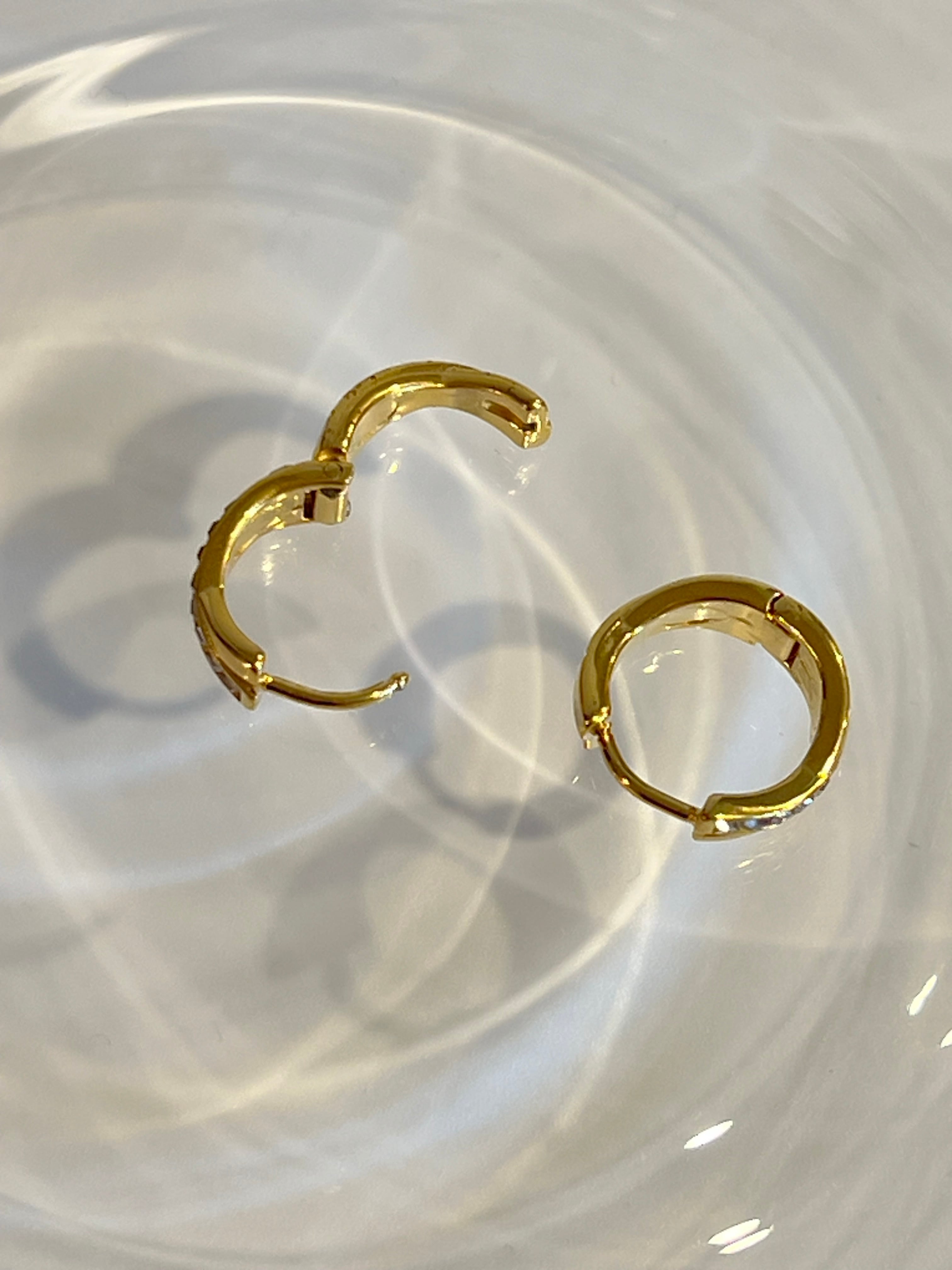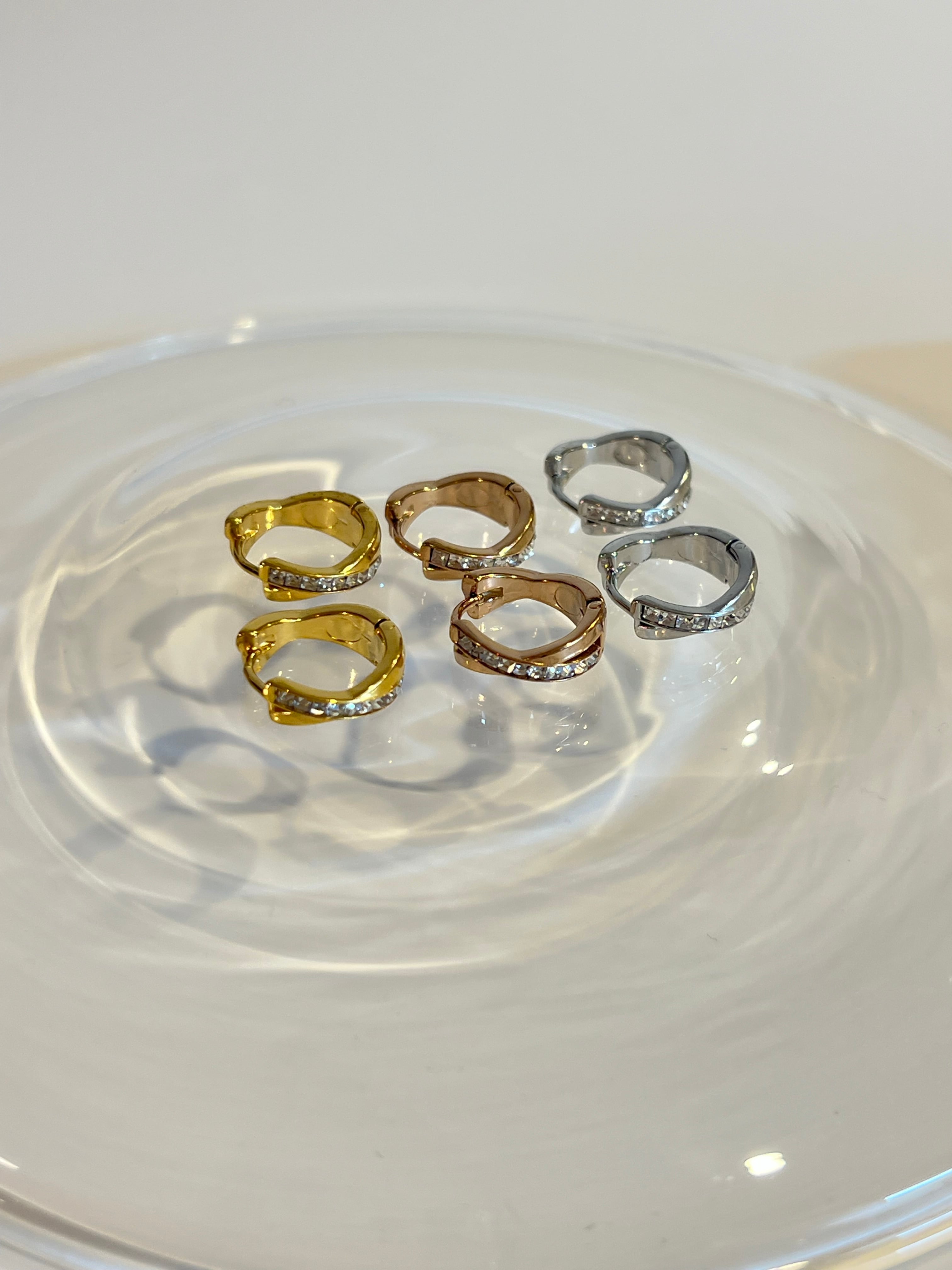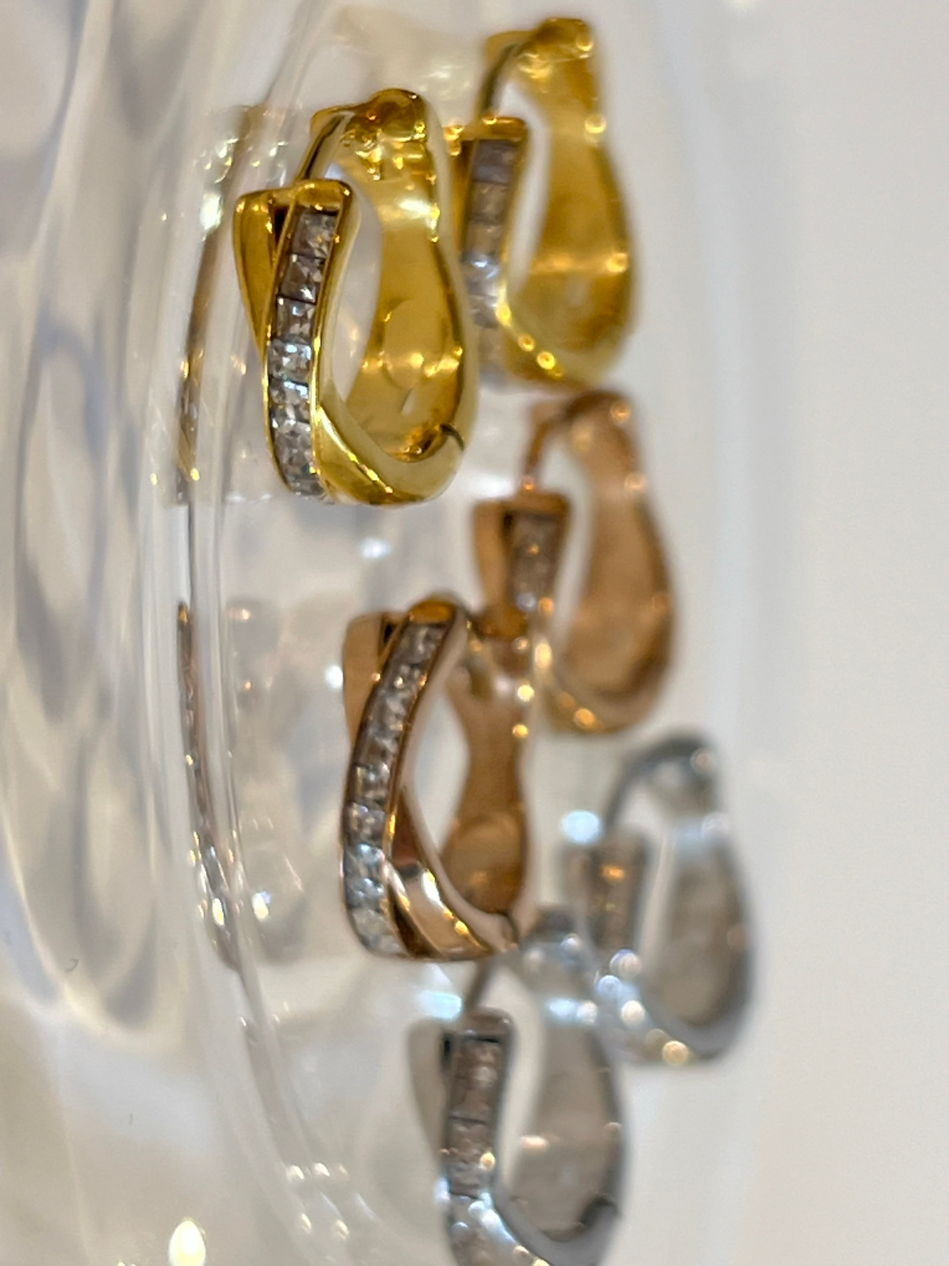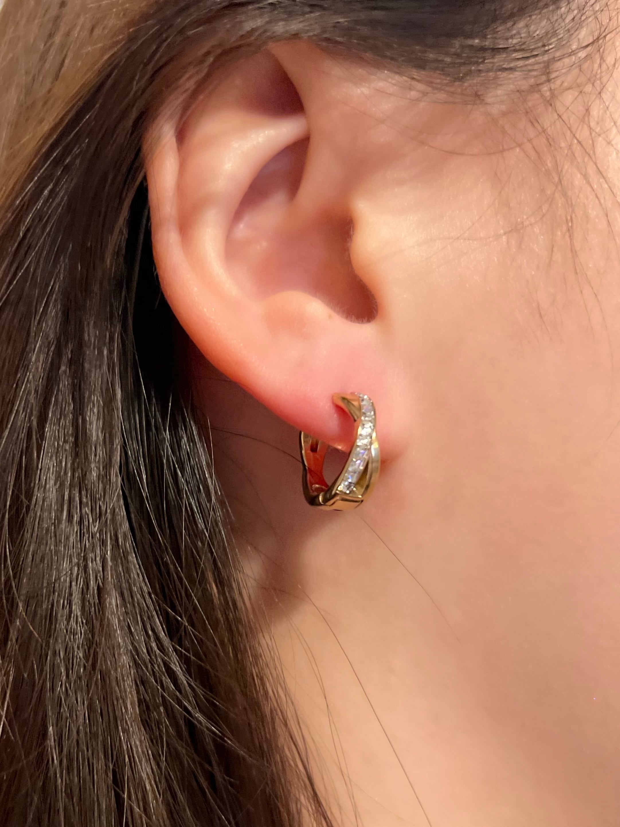 交差するラインに、きらりと輝くジルコニアを添えたフープピアス。
