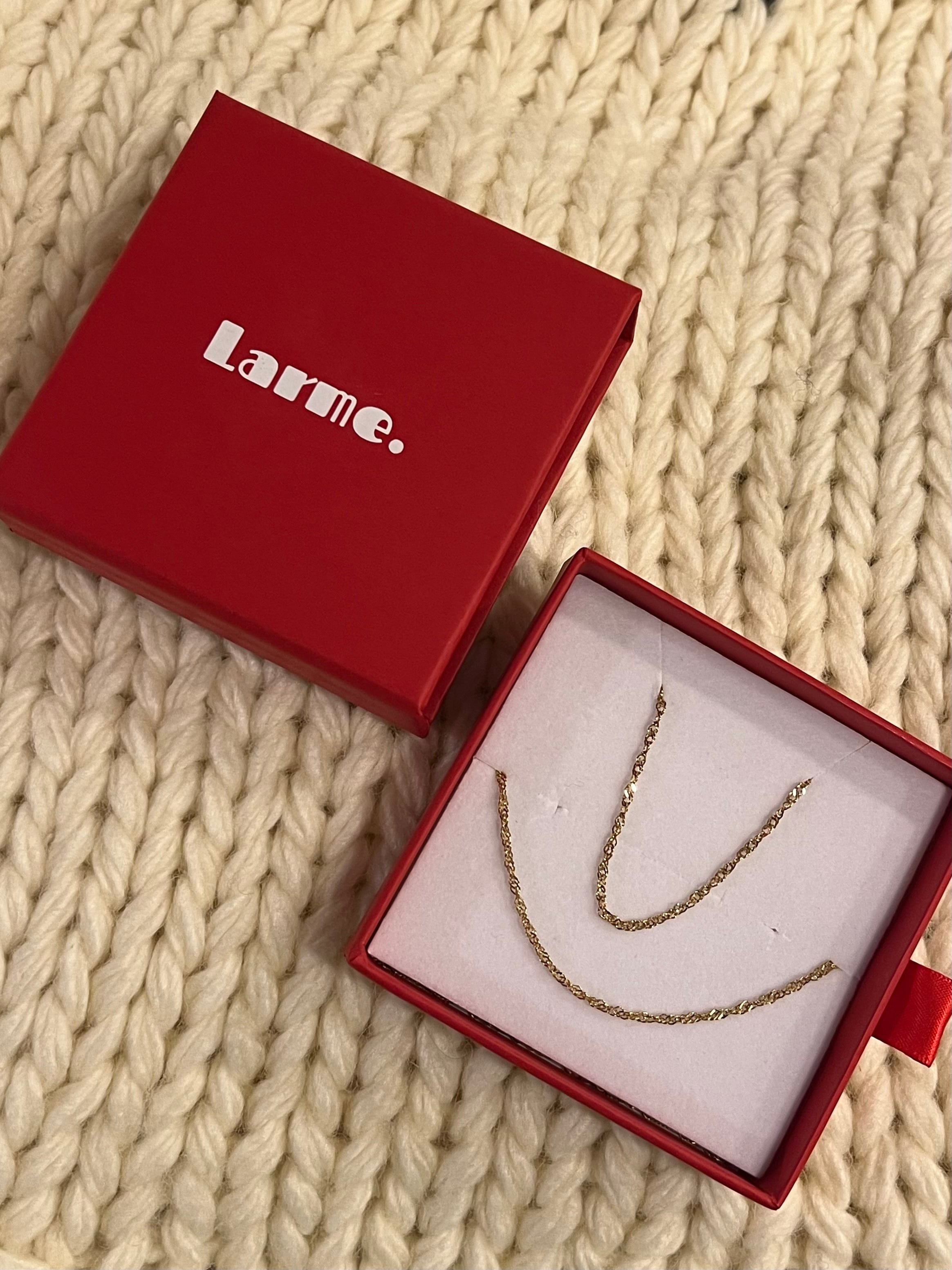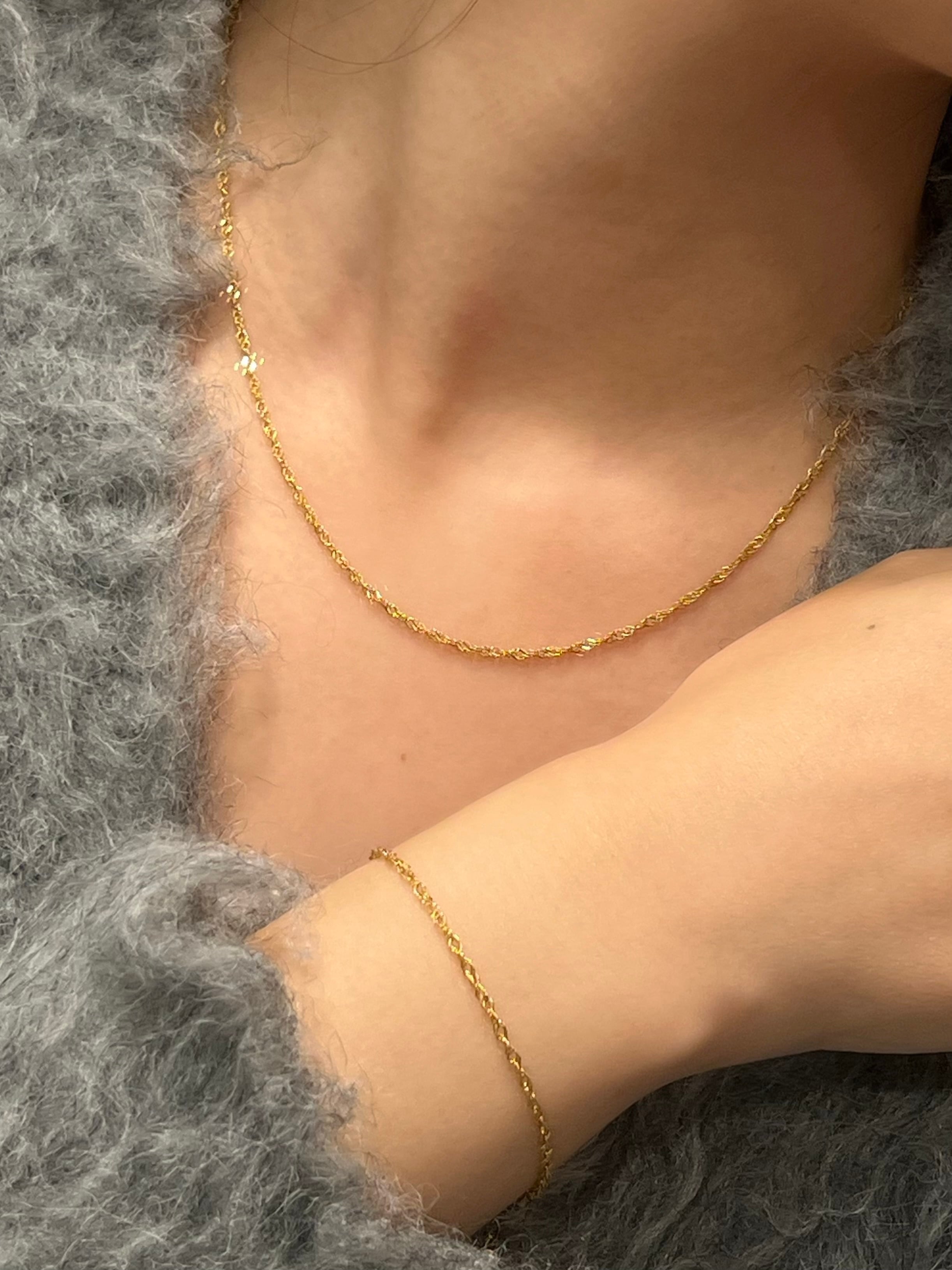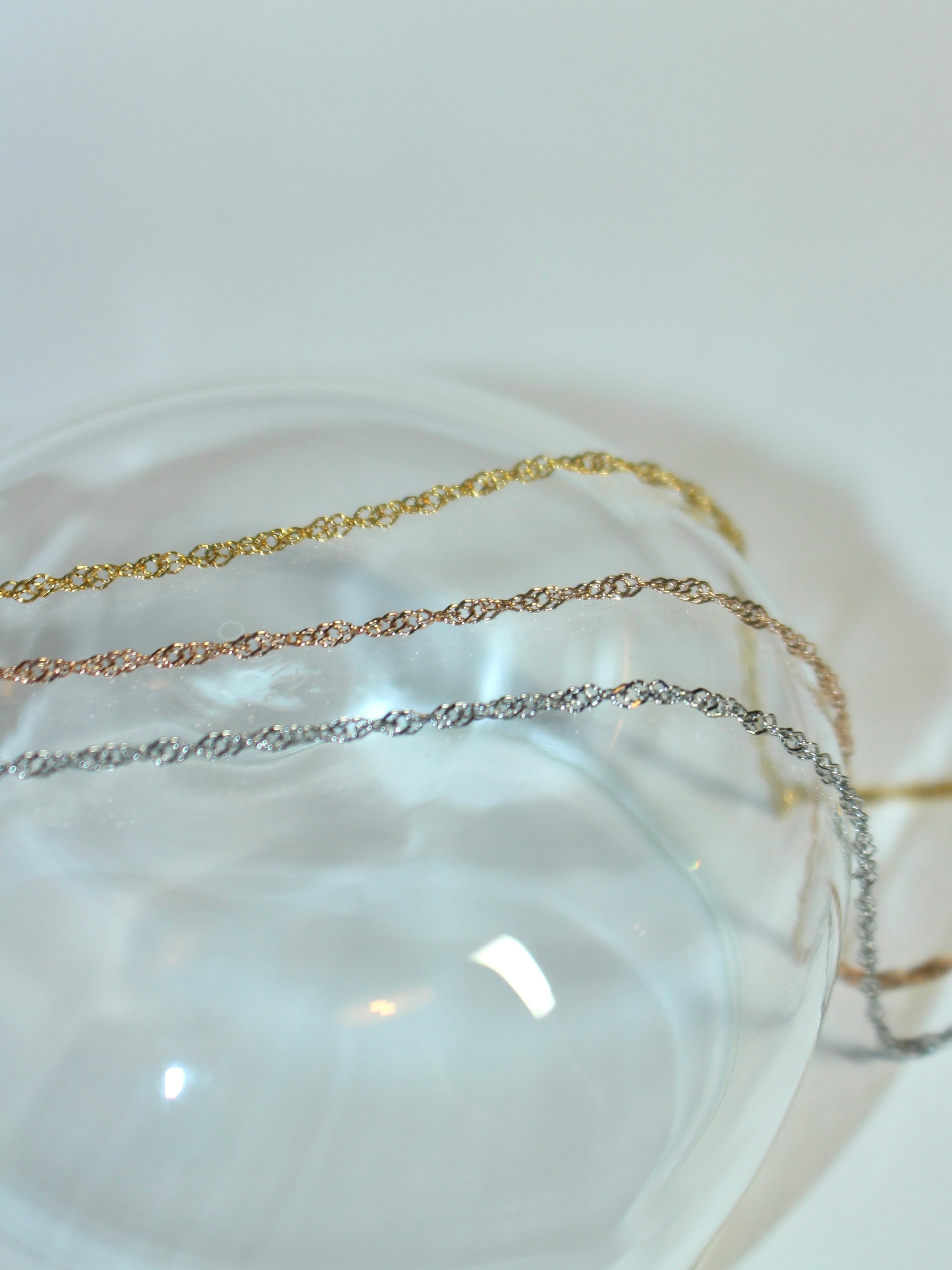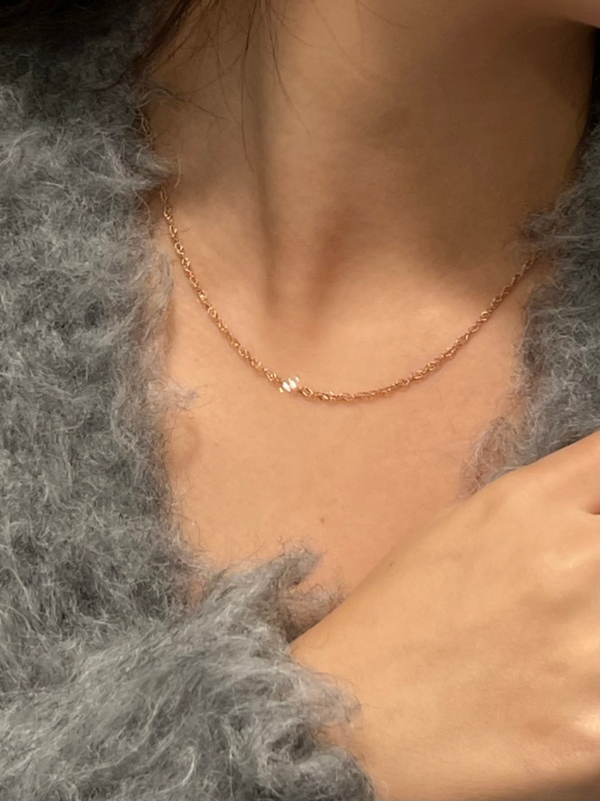 繊細なツイストが光を反射し、上品な輝きを放つスクリューチェーン。