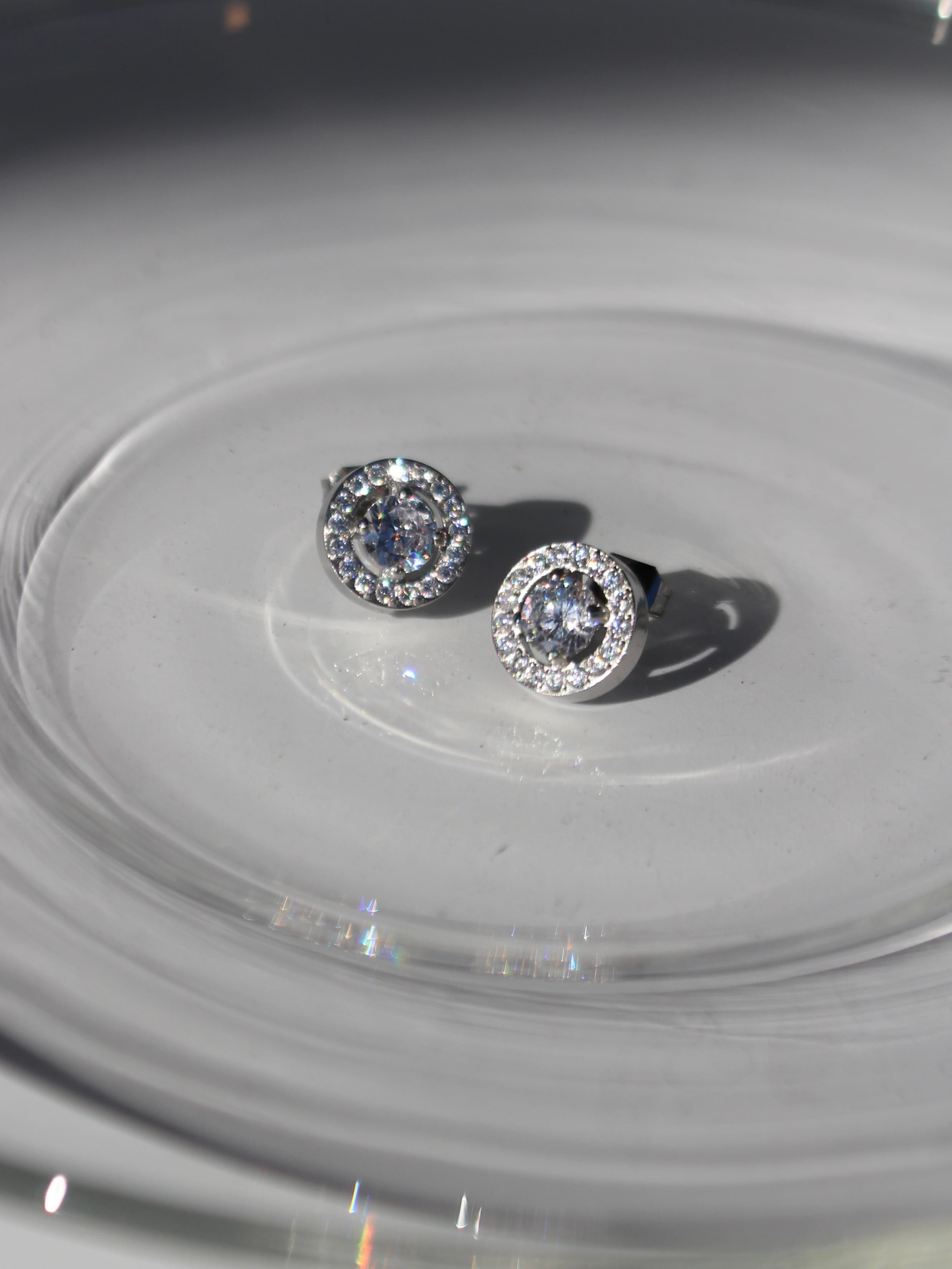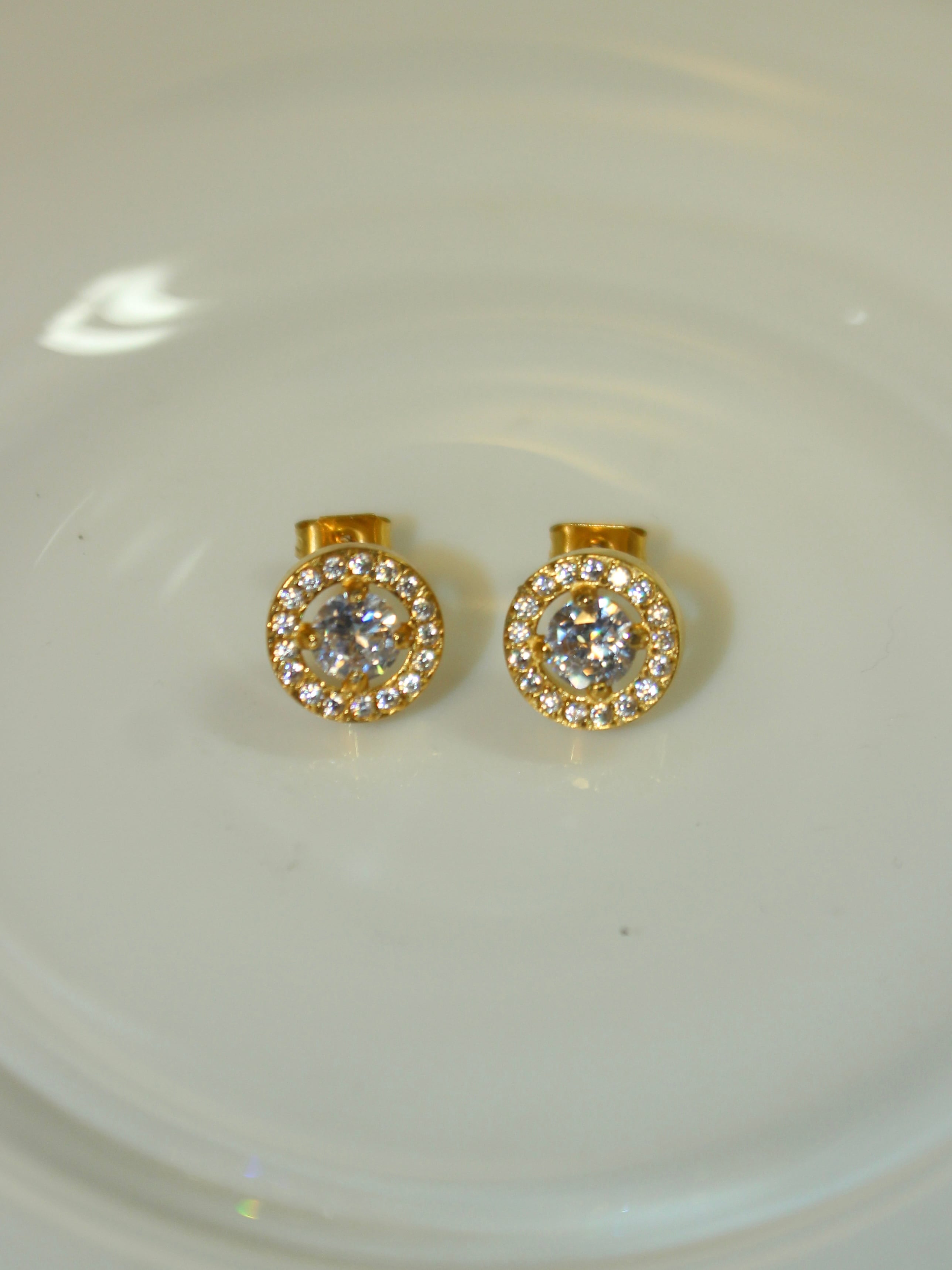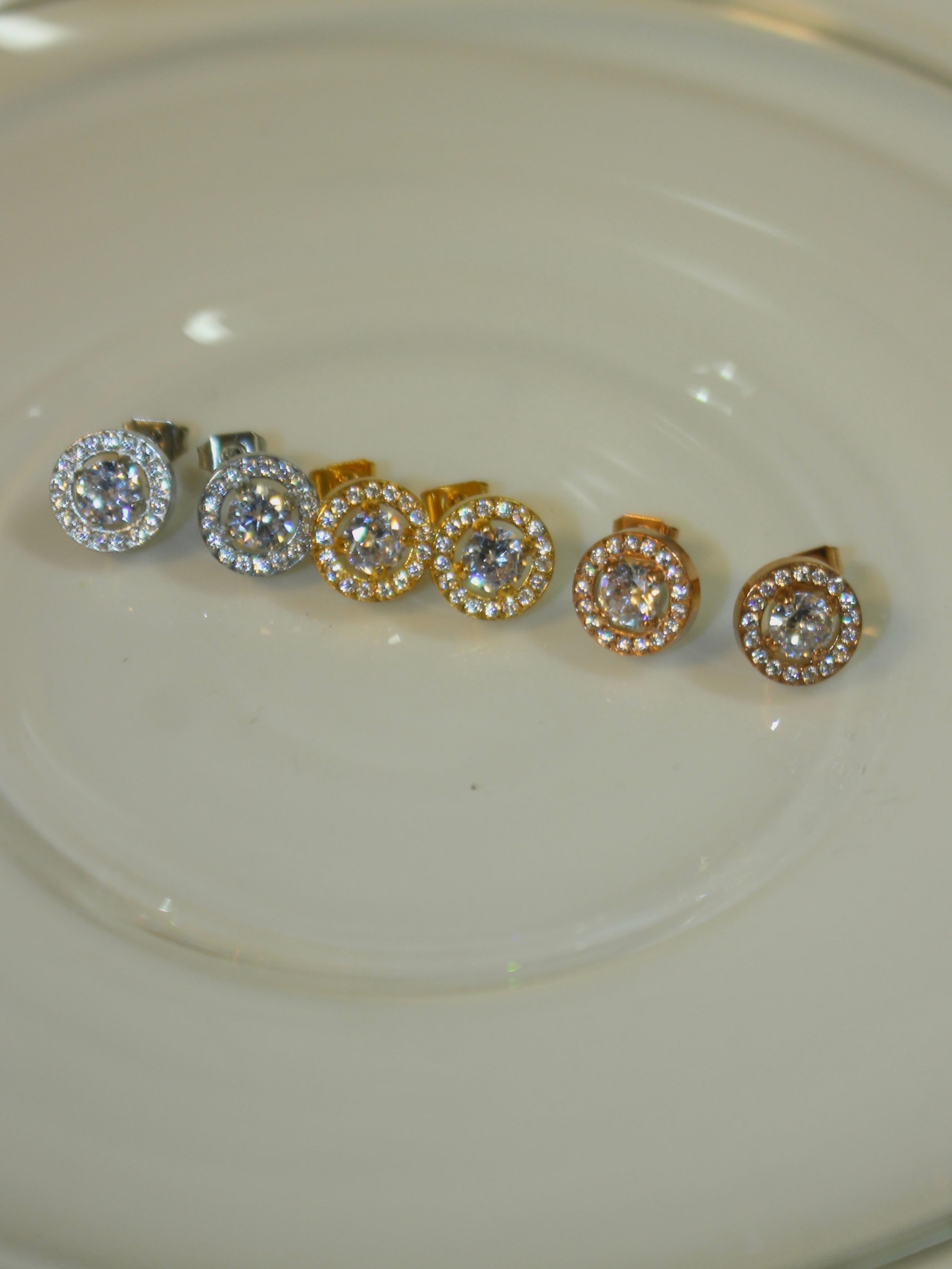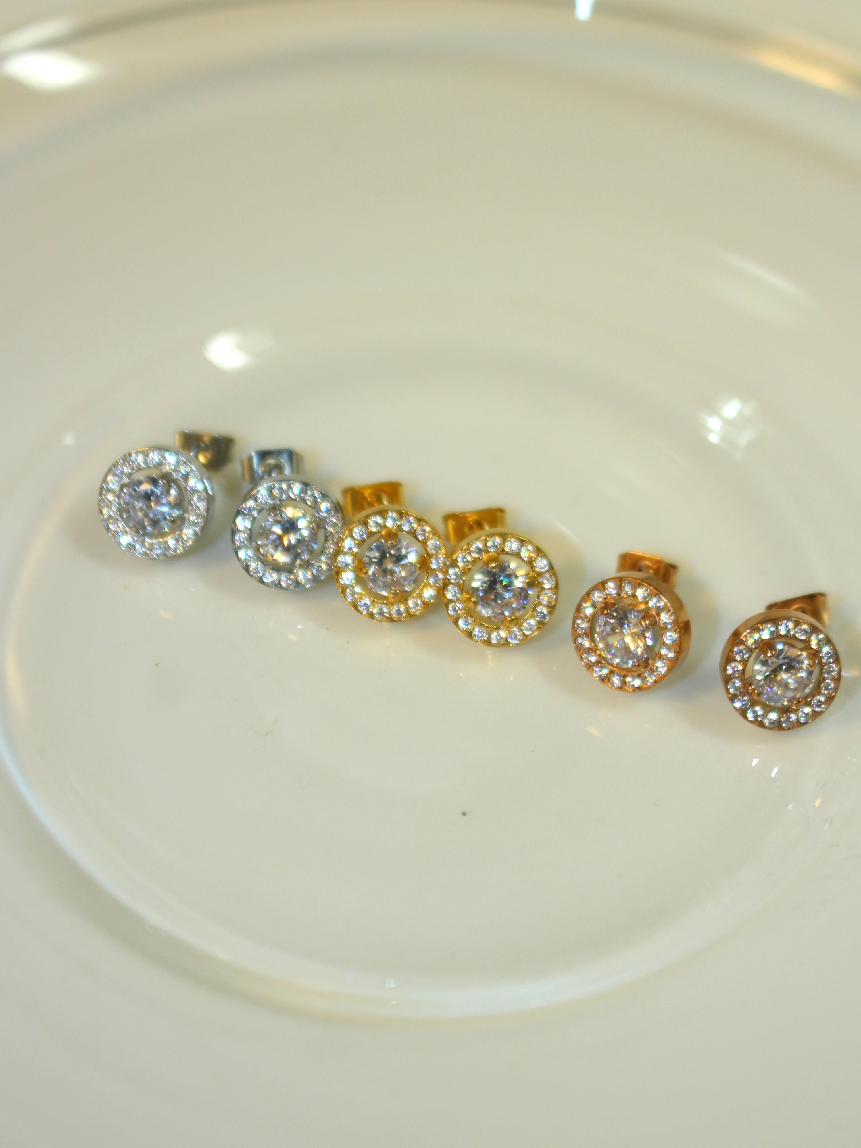 センターのジルコニアを、繊細なストーンでぐるりと囲んださりげなく華やかなピアス。