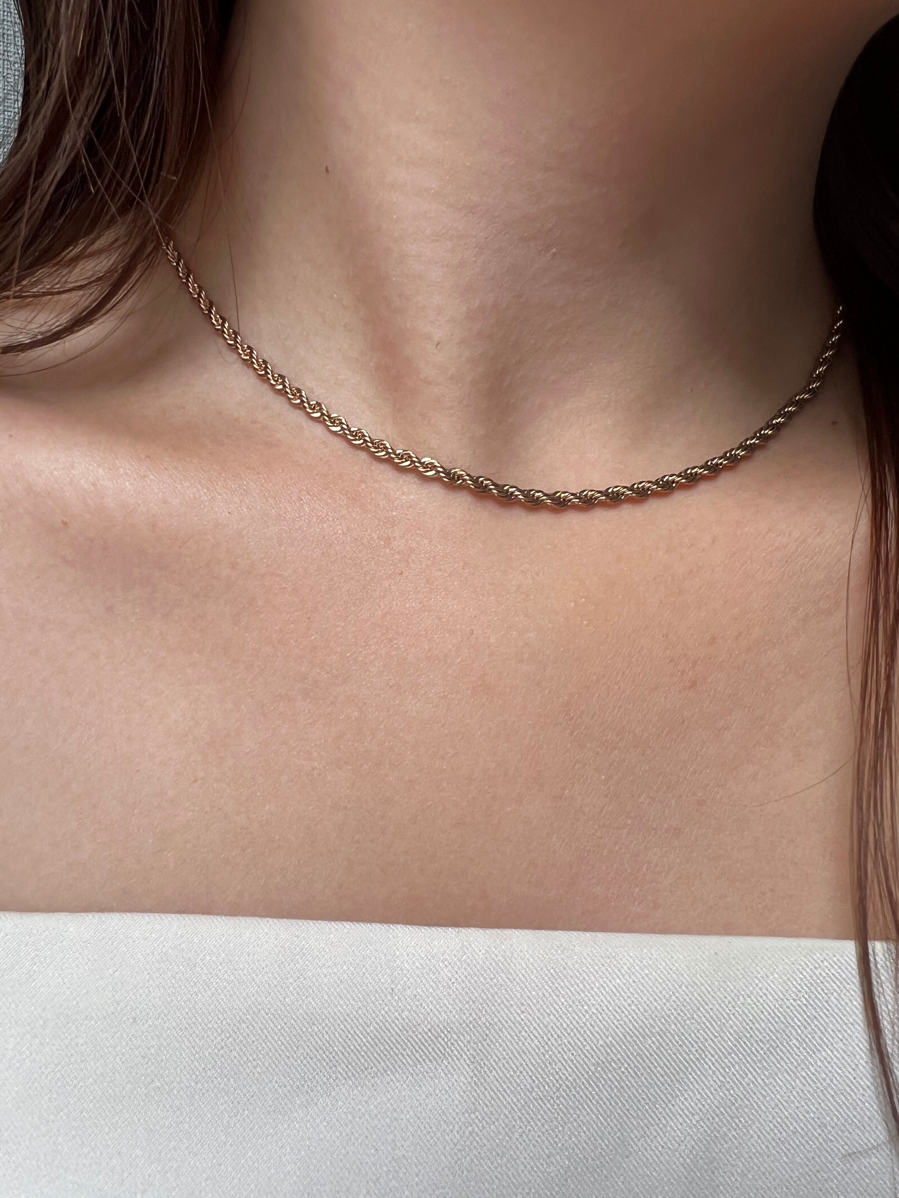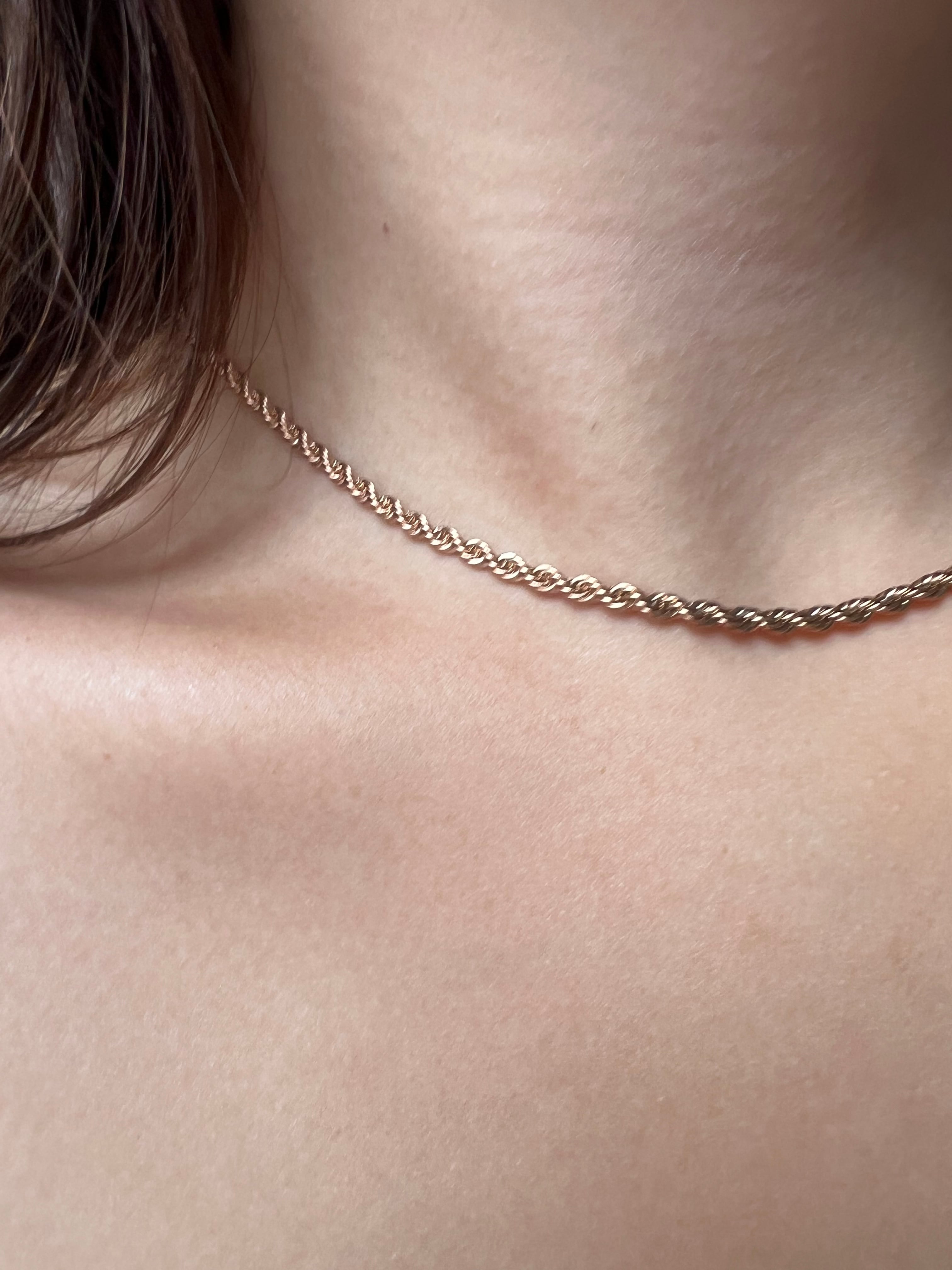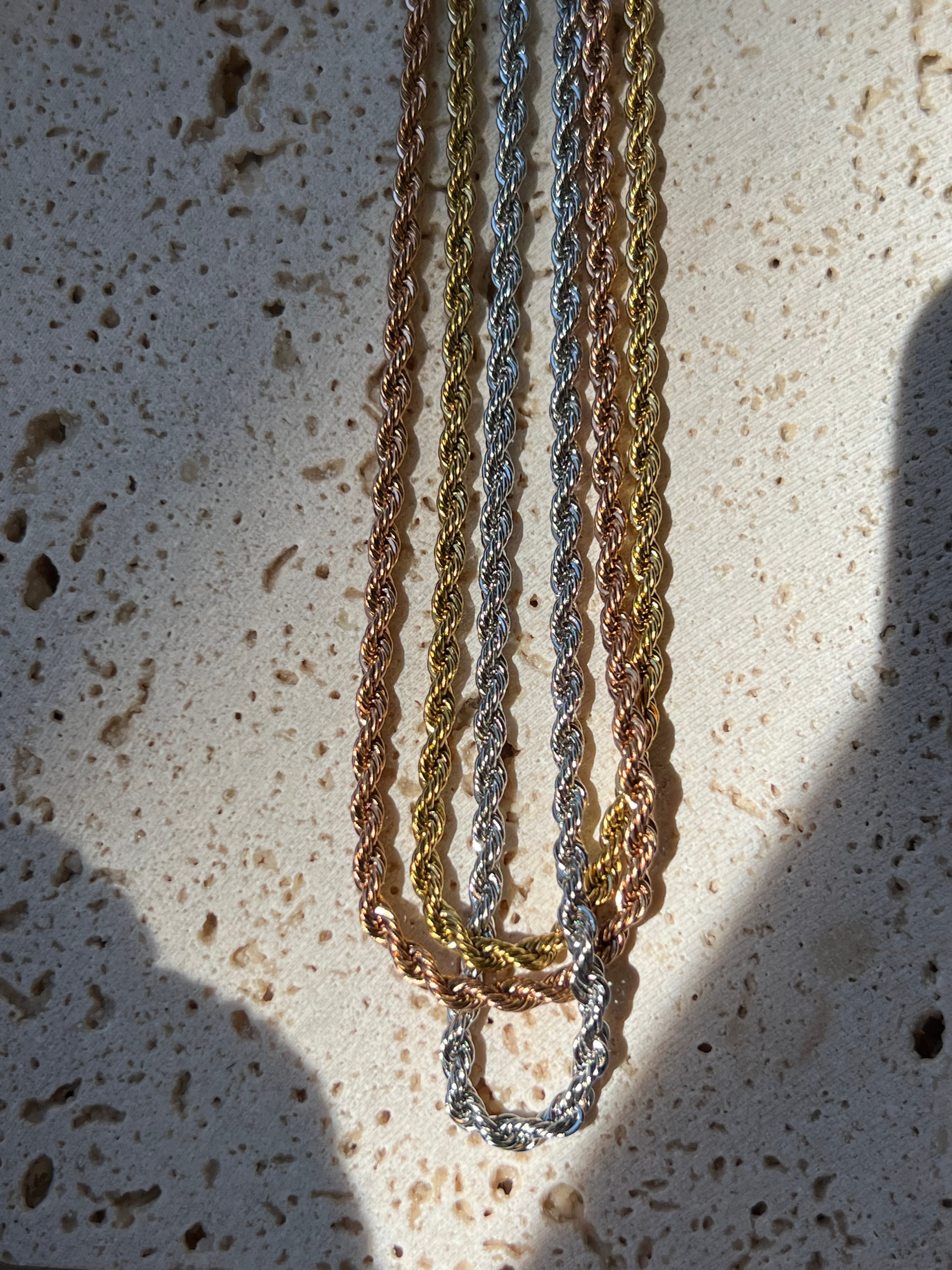 複数の小さな環が組み合わさってロープのような模様を作るロープチェーン。耐久性が高く存在感のあるデザインで人気です。